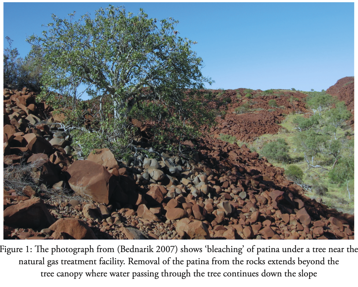 Bednarik (2007) suggested that because of the very low rainfall on Murujuga, tree canopies can retain large amounts of the dry deposits of nitrogen dioxide and sulphur dioxide because of their many layers of foliage. Rainwater falling through the foliage concentrates these acid forming chemicals beneath the trees. Bednarik (2007) collected the ‘through-fall’ rain under trees at sites on Burrup Peninsula in 2004 and found it to be highly acidic with pH as low as 3.2. He found complete removal of the rock patina below a tree adjacent to the natural gas facility where the low-pH 3.2 rain was collected (Fig. 1).