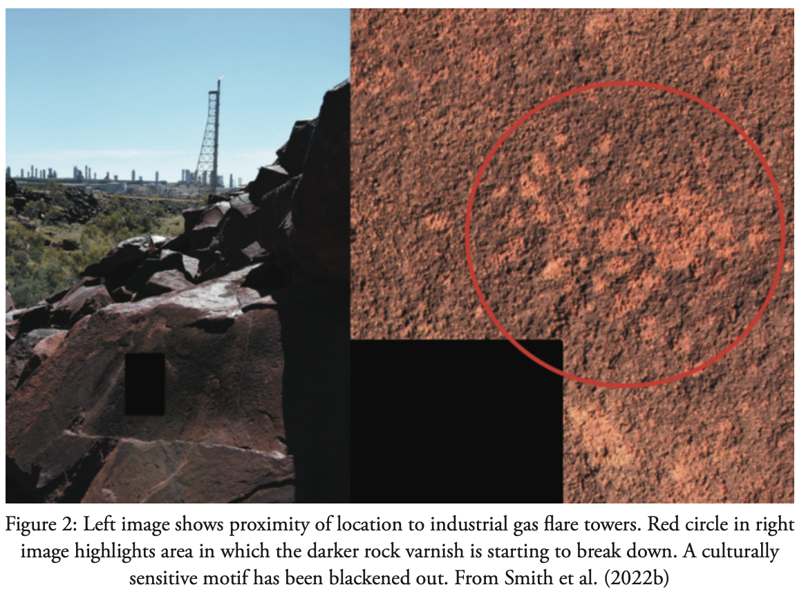These same sentiments were recently expressed by Mulvaney (2022) ‘It cannot be clearer: for the Murujuga petroglyphs to survive, industrial emissions must be eliminated …… and any future industrial development has to be placed away from the Dampier Archipelago. Industrial representatives and those in government continue with the mantra of coexistence, but what has occurred in the last 50 years proves that 50,000 years of culture heritage can be unhesitatingly erased from existence.’